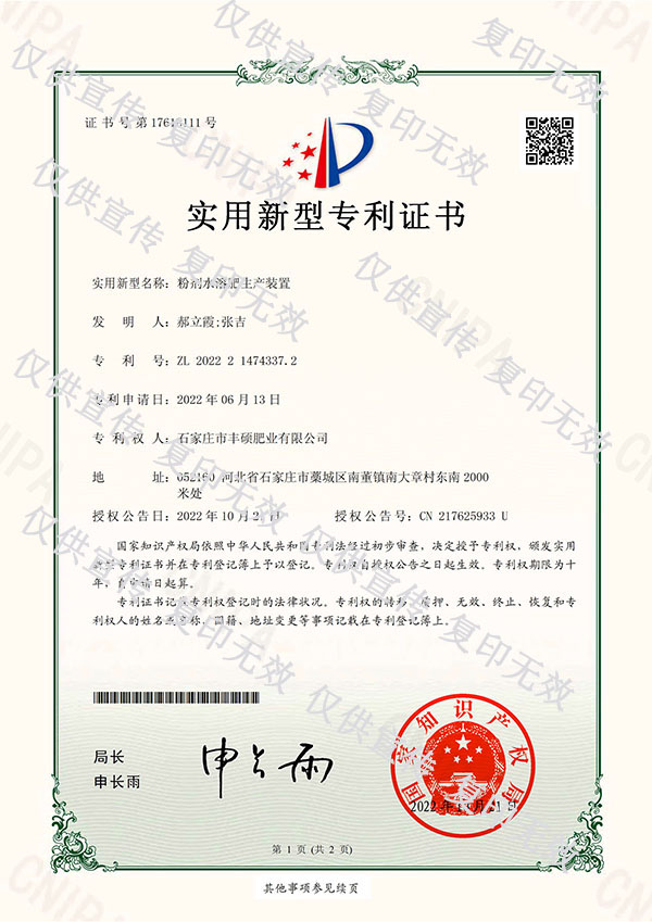 粉劑水溶肥生產裝置專利證書